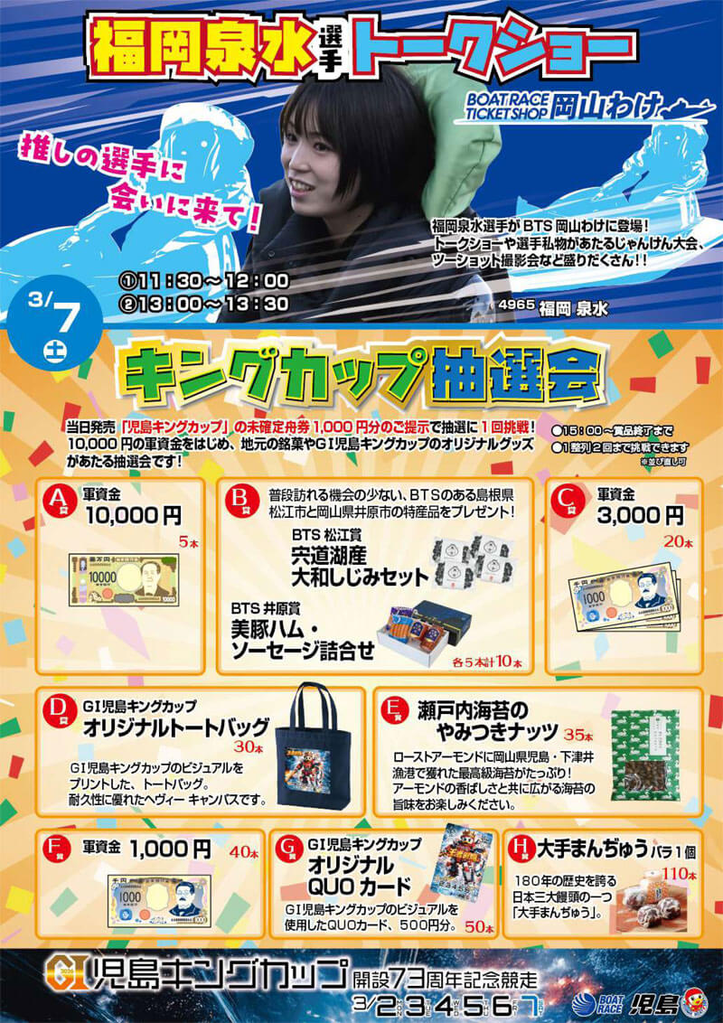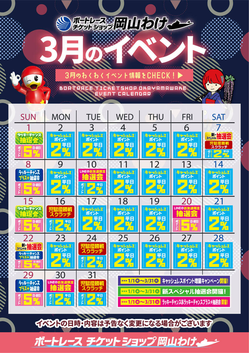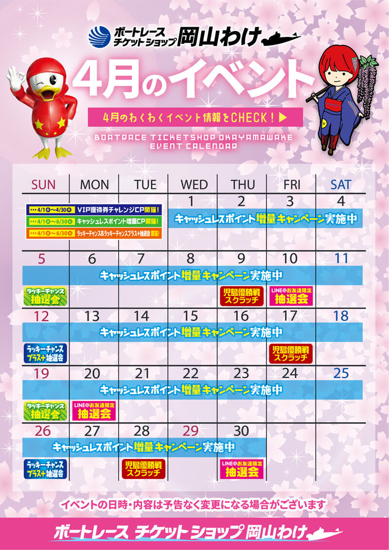 EVENT トップ > イベント イベント ボートレースチケットショップ岡山わけでは、さまざまなイベントを実施しております。 最新のイベント情報をご確認ください。(※画像をクリックすると拡大します) 4月イベントカレンダー 2026.03.18 3月7日【児島キングカップ 福岡泉水選手トークショー・抽選会】 2026.02.26 3月イベントカレンダー 2026.02.20 2月イベントカレンダー 2026.01.27 1月18日【BRびわこ BTS全力応援!全力舟券予想会】 2026.01.08 1月1日~1月3日・お正月イベント 2025.12.24 ラッキーチャンス&ラッキーチャンスプラス+抽選会 2025.12.24 新・キャッシュレス購入スペシャル抽選会 2025.12.24 VIP優待権チャレンジキャンペーン・第13弾 2025.12.24 123
