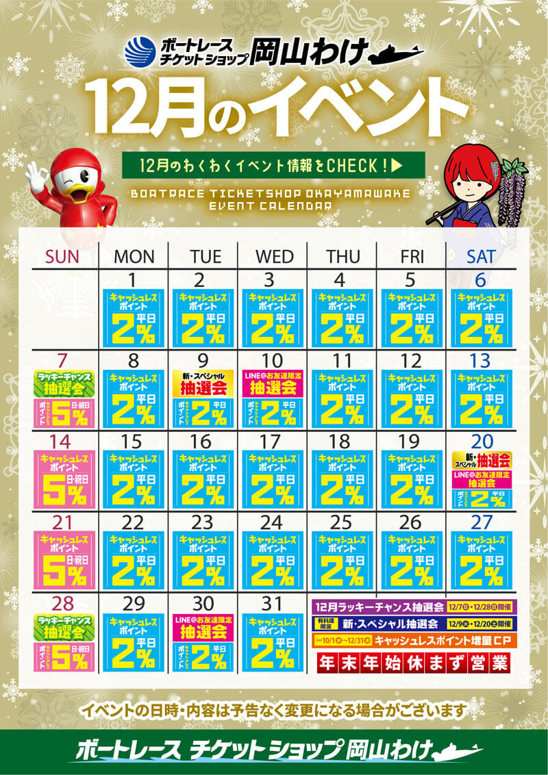 該当12レース中に、該当レースの舟券3000円以上購入ごとに1回抽選会にチャレンジ!